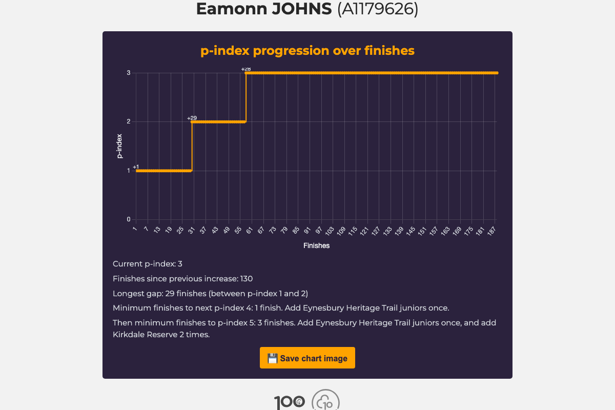 Charts p-index progression over finishes with next-step planning details for p-index challenge analysis.